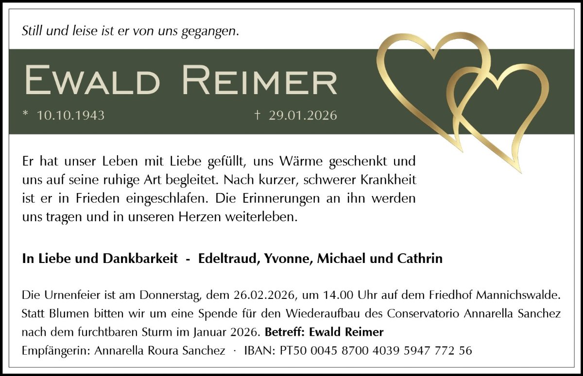 Erinnerungen an gemeinsam erlebte Momente können ein tröstlicher Begleiter in den schweren Stunden der Trauer sein, weshalb wir Ihnen auf dieser Gedenkseite einen Platz für Gedanken, Bilder und Gefühle geben möchten. Für die kommende Zeit wünschen wir Ihnen viel Kraft und Zuversicht.
